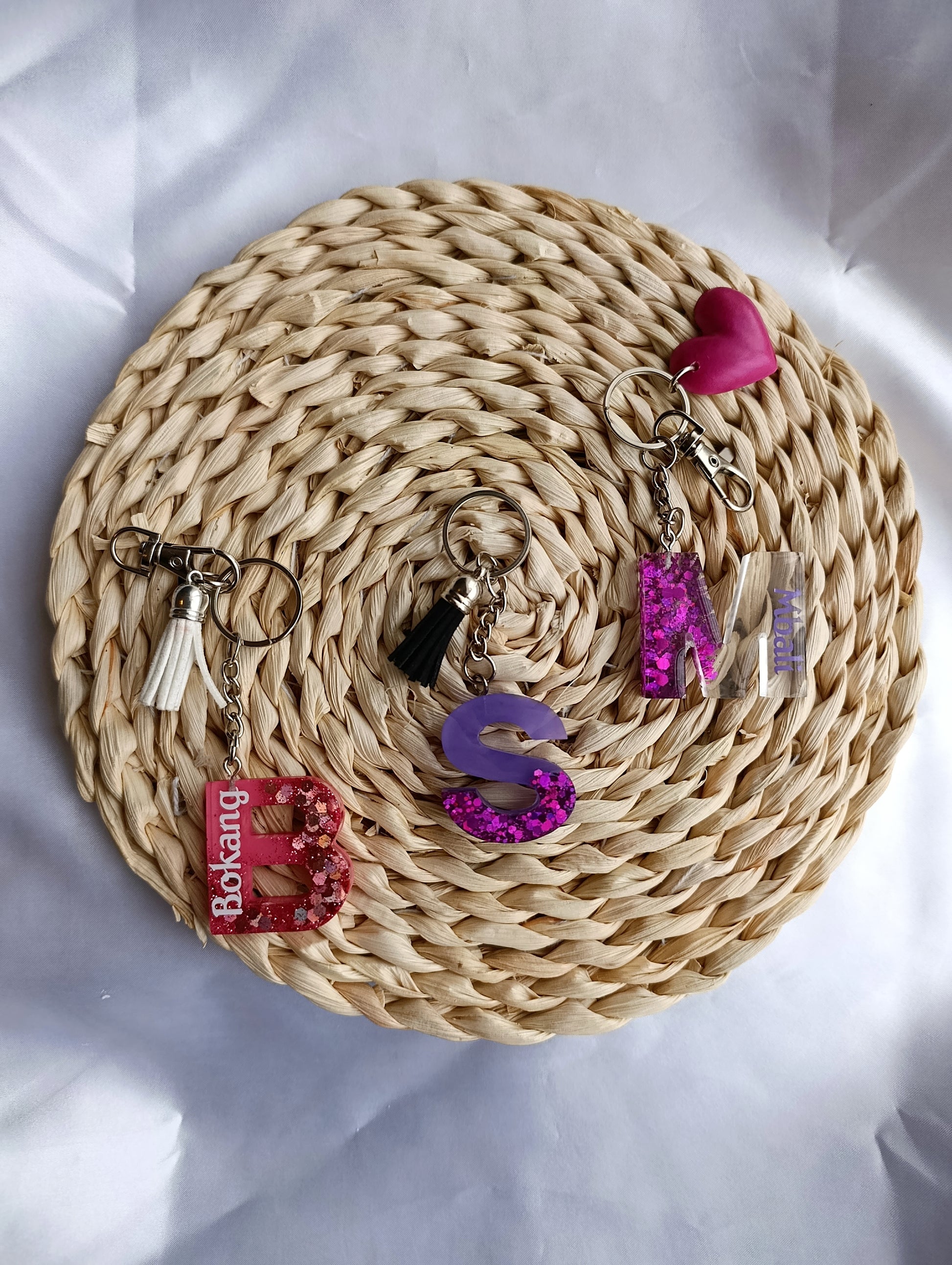 Luxe resin keychains made with glitter and a solid colour. Available in letter, heart, butterfly, circle shapes. Perfect for keys, bags, or as a gift to a loved one.